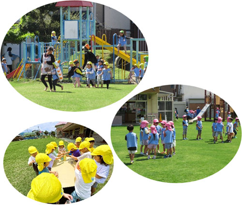 子どもたちが安全に思いっきり遊べるよう、広い全面芝生の園庭です。芝生は、環境にやさしく、子どもたちは裸足で走ったり、転がったりとのびのび遊んでいます。転んでも芝生がクッションになり、けがをしにくくなっています。